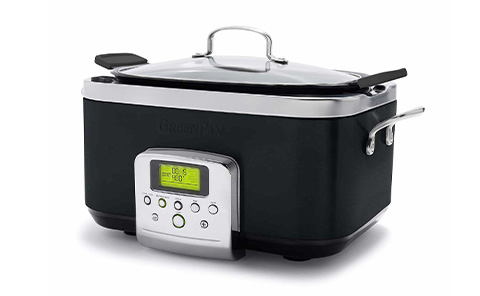 With this 8-in-1 programmable slow cooker, you can sear, roast, brown, and steam meat & veggies with convenient presets. Enjoy one-step browning and slow cooking in a durable, hard-anodized 6-quart pot with nonstick Thermolon Volt coating. The silicone side handle ensures safe handling, and the cord tucks neatly in the back panel. The cooking surface is a healthy, PFAS-free ceramic that is dishwasher safe for easy cleanup.